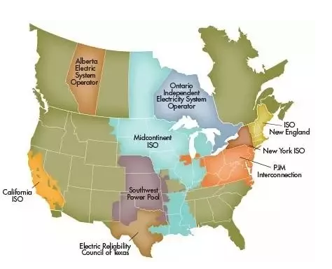 北美9大区域电力市场示意图。加拿大中部安大略与阿尔伯塔等省,与美国电力市场联系比和国内更为紧密。