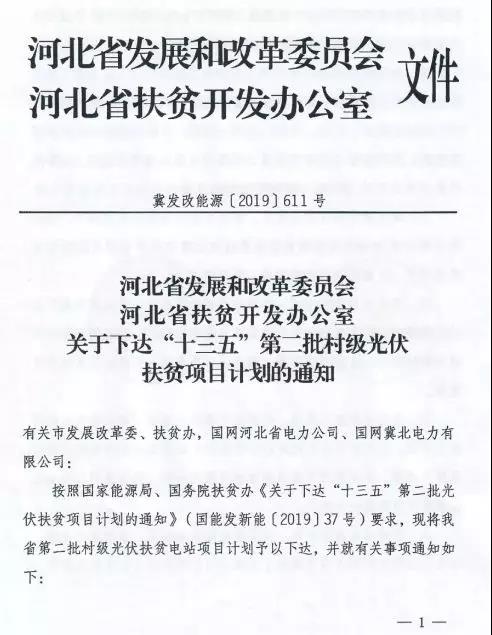近日,河北省发改委下发《关于下达“十三五”第二批村级光伏扶贫项目计划的通知》,下达河北省18个县村级光伏扶贫项目702个,总规模348575千瓦,涉及1107个建档立卡贫困村,可以帮扶贫困户数51489户贫困户。
