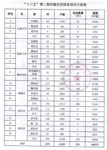 河北省“十三五”第二批光伏扶贫项目计划:18个县村级光伏扶贫项目702个