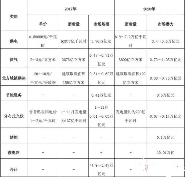 从市场需求看,若仅选取供电、供气、北方城镇供热、分布式光伏、节能服务、微电网、储能七个主要的业务领域进行分析测算,2017年市场规模超4.9~5.47万亿元,到2020年市场潜力至少为5.28~6.29万亿元,具体估算如表2所示。