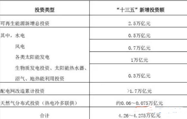 从可再生能源投资力度来看,光伏发电成为各类可再生能源中的投资重点。《可再生能源发展“十三五”规划》显示,到2020年,我国水电将新增投资约5000亿元;我国新增风电投资约7000亿元;我国新增各类太阳能发电投资约1万亿元。加上生物质发电投资、太阳能热水器、沼气、地热能利用等,“十三五”期间可再生能源新增投资约2.5万亿元。