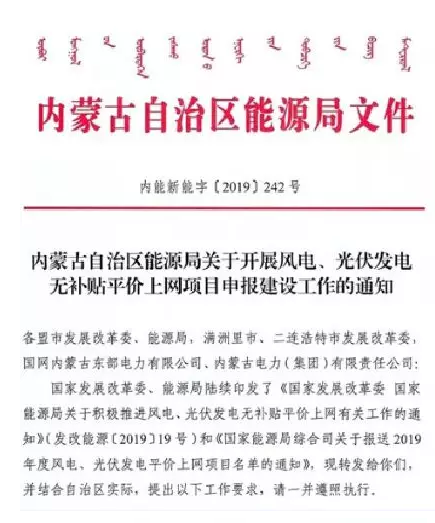 日前,内蒙古自治区能源局下发通知,要求各地上报无补贴风电、光伏平价上网项目。通知提出:橙色地区只允许存量项目转平价,绿色地区鼓励存量项目转平价,允许报新项目。