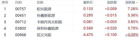 继4月30日光伏太阳能板块龙头公司逆市上涨之后,5月1日港股的光伏板块继续大涨,截至收盘,协鑫新能源涨逾5%领涨全板块,保利协鑫能源涨逾3%,信义光能涨逾2%。