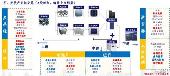 光伏行业上游硅料的代表企业包括江苏中能、通威、东方希望等;中游制造商中,硅片可以关注A股市场隆基股份、中环股份,港股市场的保利协鑫,电池片中通威的优势较大。组件方面是产业链中最为被动的环节,面临上下游挤压,盈利能力偏弱,且竞争格局变化较快。而下游电站、EPC等相关企业包括国电投、协鑫新能源、中广核等。