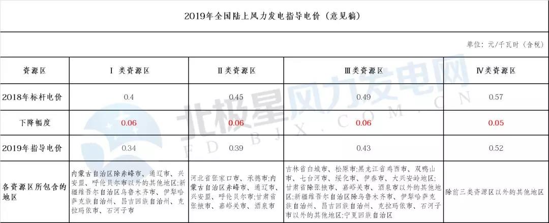 有消息称,会议讨论结果为:I、II、III、IV类陆上风资源区2019年即将出台的“指导性电价”,分别为0.34元/千瓦时、0.39元/千瓦时、0.43元/千瓦时、0.52元/千瓦时,相比2018年分别下降0.06元、0.06元、0.06元、0.05元。