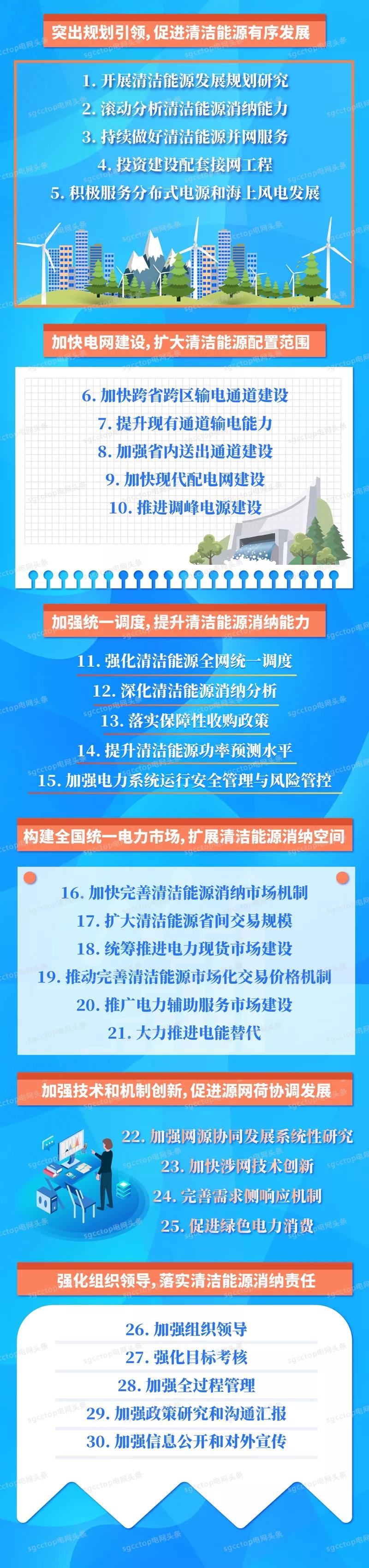 公司将坚决贯彻党中央、国务院决策部署,落实《清洁能源消纳行动计划(2018~2020年)》各项重点工作,按照“三型两网”世界一流能源互联网企业建设要求,围绕引导清洁能源有序发展、加快电网建设、加强统一调度、扩大交易规模、加强技术和机制创新、强化组织领导等6大方面,实施30项重点工作。