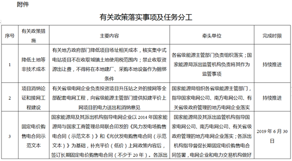 六、协同落实支持风电、光伏发电平价上网政策措施。各省(区、市)发展改革委(能源局)要抓紧组织风电、光伏发电平价上网项目建设工作,会同地方各级政府部门落实降低项土地相关成本有关政策要求。国家电网公司、南方电网公司及有关省级政府管理的地方电网企业做好有关平价上网项目的电力送出和消纳落实工作,规范签订长期固定电价购售电合同(不少于20年)。国家发展改革委、国家能源局将加强对有关平价上网项目政策落实的指导和督促。有关政策落实事项及任务分工见附件。