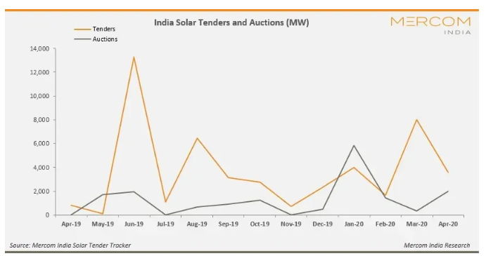 根据Mercom的统计数据显示, 2020年四月份印度的光伏招标与三月份相比减少了45%。其中,四月份共发布了3.6GW容量的光伏招标,而此前的三月份公布的数字超过了8GW。