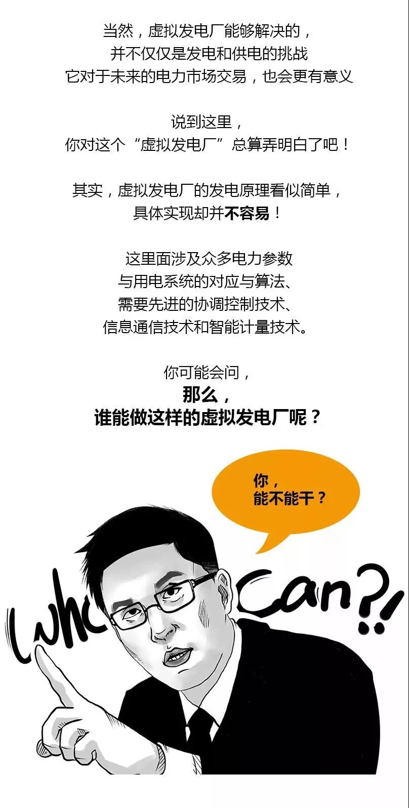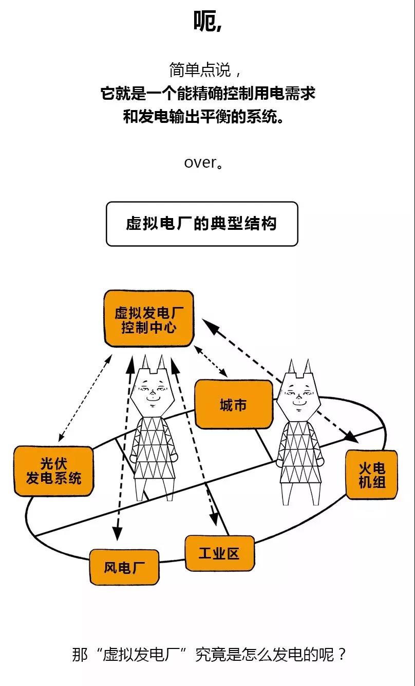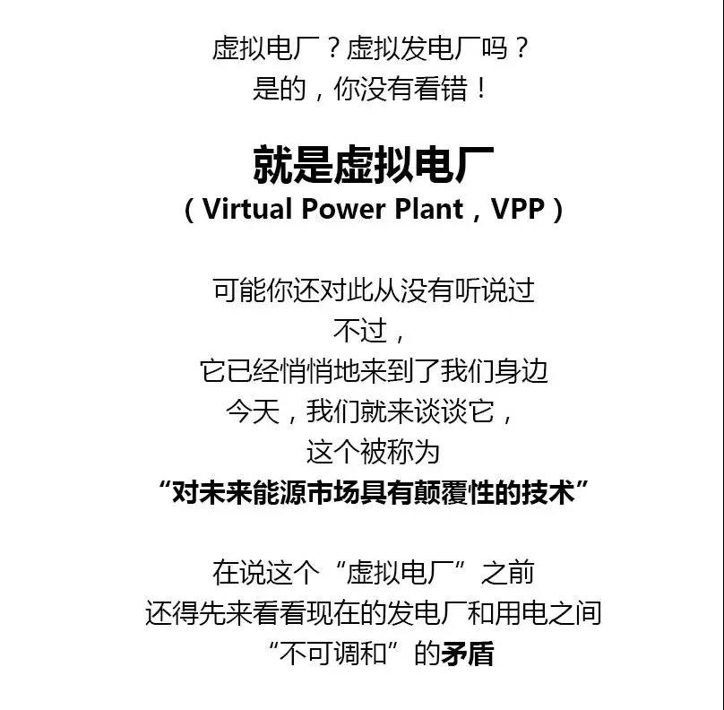 所谓虚拟,体现在它并不具有实体存在的电厂形式,却真有一个电厂的功能,而且是远超传统实体电厂的功能,因为它打破了传统电力系统中发电厂之间、发电侧和用电侧之间的物理界限。它是互联网+源网荷储售服一体化(即电源、电网、负荷、储能、销售、服务的聚合体)的清洁智慧能源管理系统,是对多种分布式能源进行聚合、优化控制和管理,为电网提供调频、调峰等辅助服务,并能够参与电力市场交易的技术和商业模式。