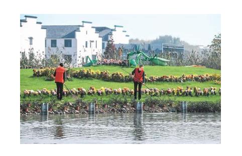 湖州市长兴县河长虹星桥镇港口村东港内,河长在打捞水面漂浮物