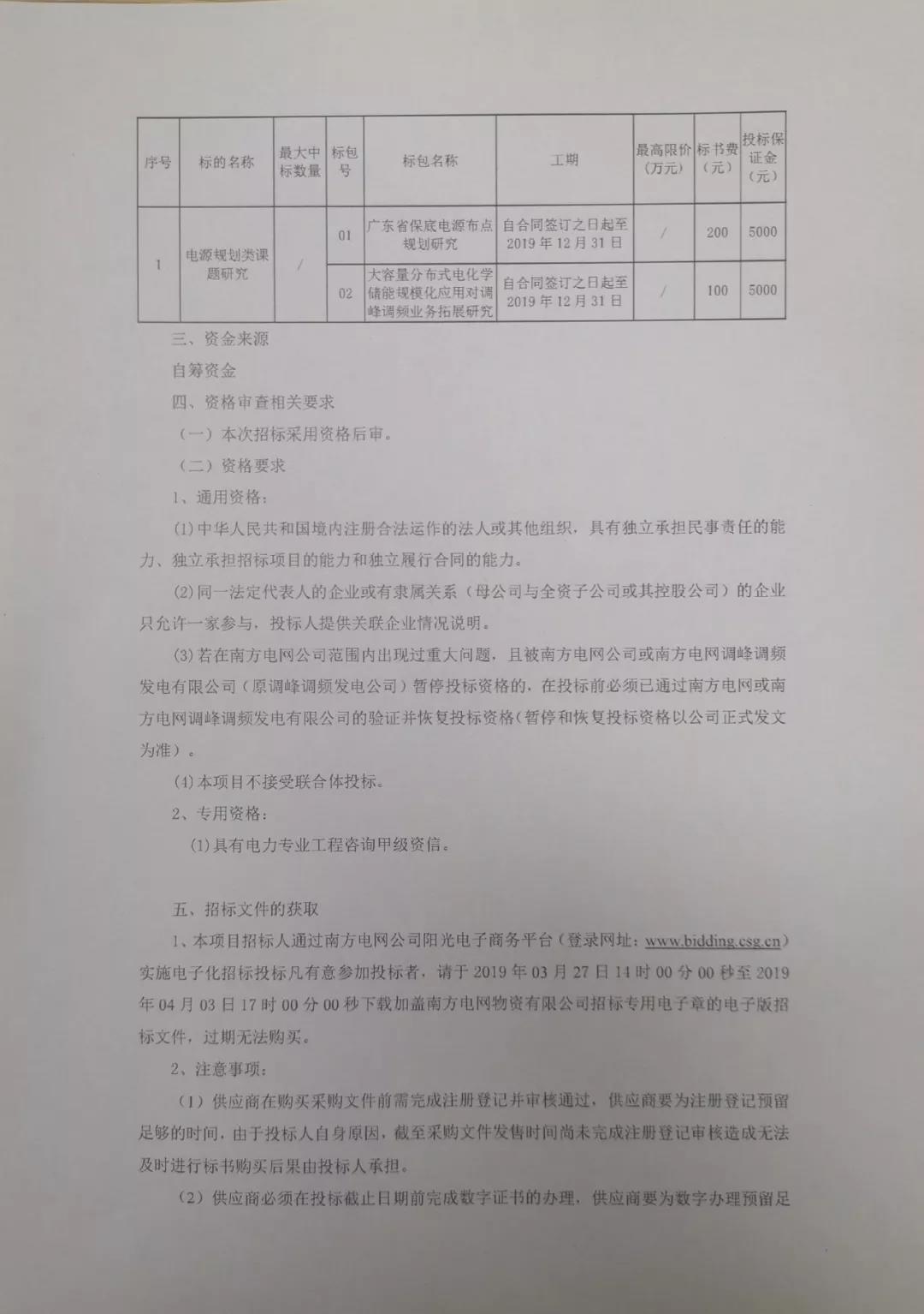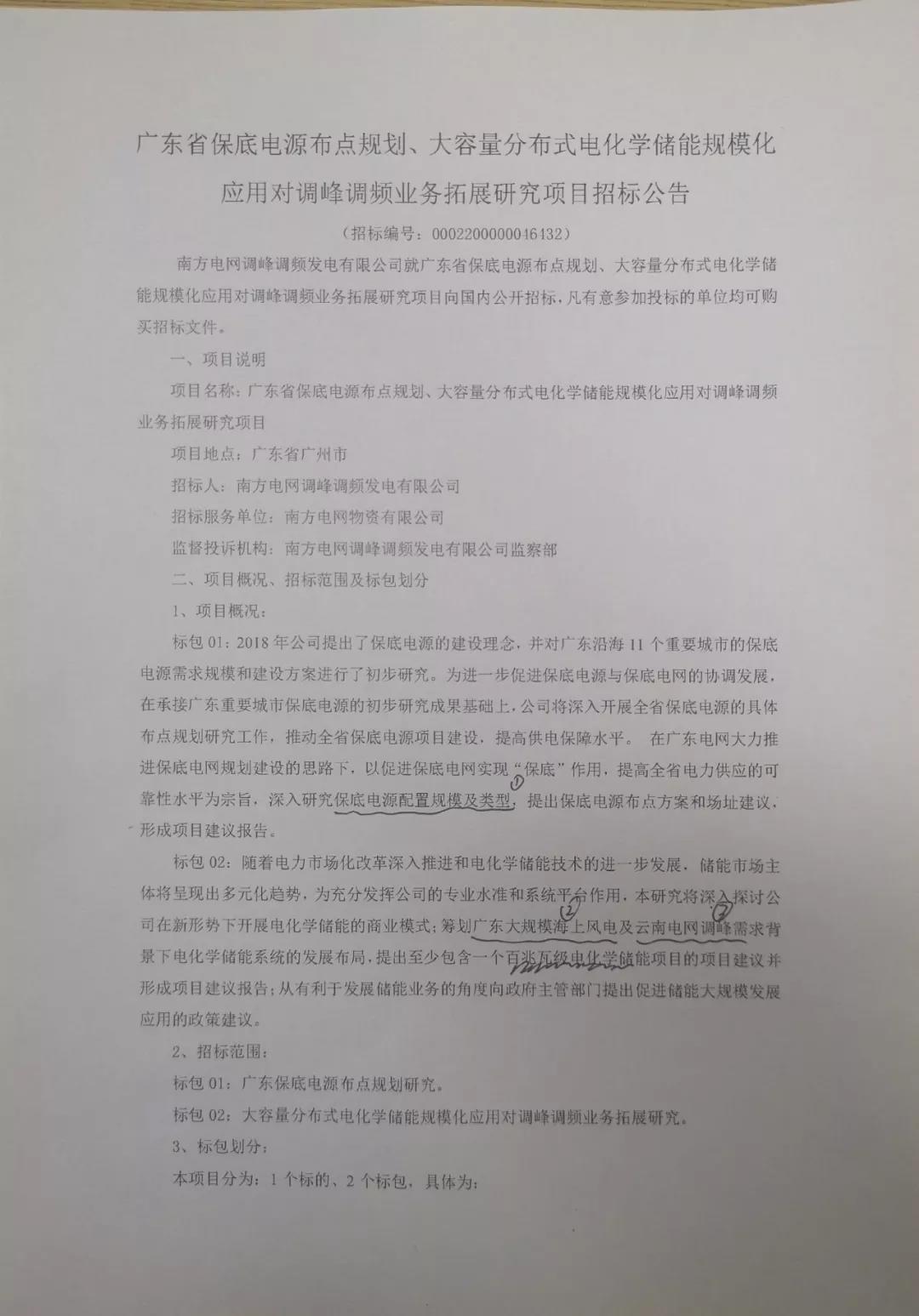 3月27日,南方电网调峰调频公司就广东省保底电源布点规划、大容量分布式电化学储能规模化应用对调峰调频业务拓展研究项目向国内公开招标。