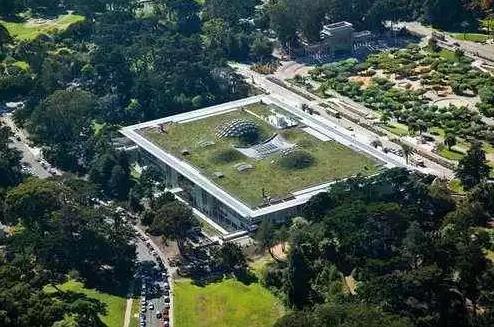 从热带雨林的顶层可以走到科学院大楼的屋顶。“绿色屋顶”模仿山势起伏,共有7个隆起的山丘。这种起伏的姿态实际上是经过测算的,根据冷空气下沉热空气上升的原理,可形成大楼内空气的自然流通,并起到绝缘作用,减少了对空调的依赖。屋顶种植了170万株当地植物,期待这块世界上面积最大的绿色屋顶能吸引大批本地的蝴蝶、蜂鸟或其它鸟类和昆虫前来栖息。