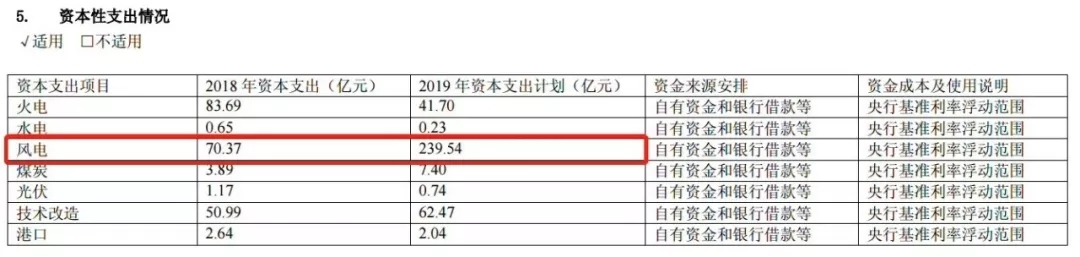 计划投入的资金着实吓人,2019年要投资239.54亿元做风电,而2018年公司风电资本支出仅仅为70.37亿元,同比增长2.4倍。