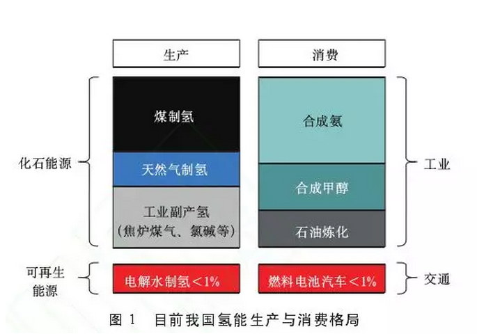 我国已具备一定氢能工业基础,全国氢气产能超过2000万t/a,但生产主要依赖化石能源,消费主要作为工业原料,清洁能源制氢和氢能的能源化利用规模较小。国内由煤、天然气、石油等化石燃料生产的氢气占了将近 70%,工业副产气体制得的氢气约占30%,电解水制氢占不到1%,见图1。国内外能源企业结合其各自优势选择不同技术路线,纷纷布局氢能源生产与供给,煤制氢、天然气制氢、碱性电解水制氢技术和设备已具备商业化推广条件。