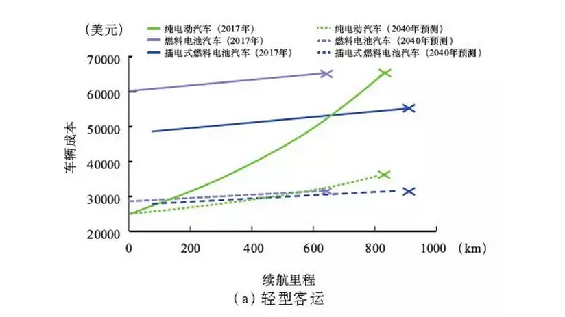 对于燃料电池汽车,目前国内车用燃料电池成本还高达 5000 元 /kW 以上,因此整车成本远高于动力电池汽车和燃油车。目前制约燃料电池车应用的最大因素也是车的成本太高,主要是由于燃料电池组产量低,使得单价居高不下。根据美国能源部(DOE)由学习曲线做的燃料电池成本和产量关系的测算,随着生产规模的扩大化,燃料电池的成本将大幅下降,见图4。基于2020年的技术水平,在年产50万套80kW电堆的规模下,质子交换膜燃料电池系统成本可降低到40美元/kW(约合260元 /kW), 即 80 kW燃料电池汽车的电池系统总价约 2 万元。而按照国际能源署预测,2030年锂离子电池系统成本有望降低至100 美元,同等水平的60kWh动力电池 车电池系统总价约为 4 万元。