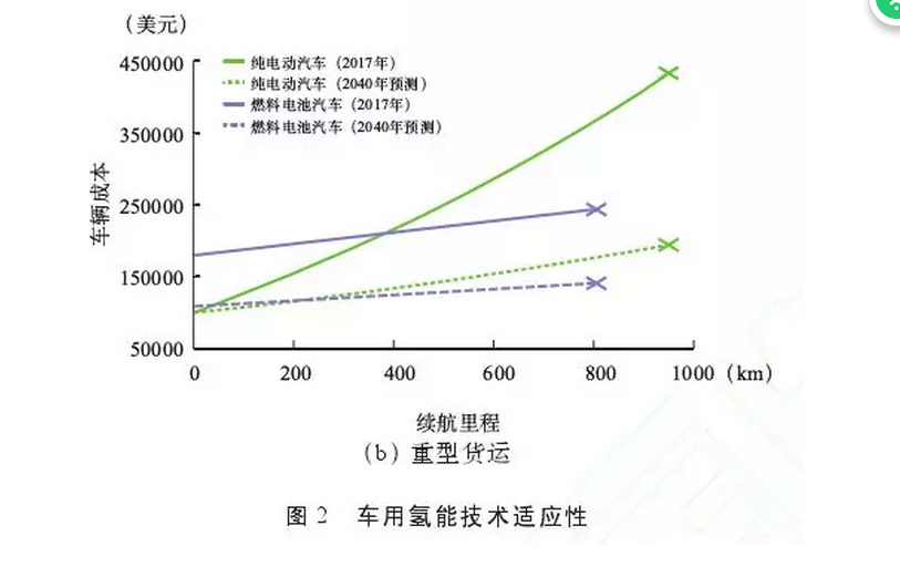 虽然目前氢能以工业原料消费为主,但未来交通部门应用潜力巨大。燃料电池功率和储能单元彼此独立,增加能量单元对车辆成本和车重影响相对较小,氢燃料电池在重型交通领域相比锂电池具有更强的技术适应性。图 2 为氢燃料电池汽车和纯电动汽车在轻型客车(图 2a)和重型货车(图 2b)应用中的成本对比,可见随着车重和续航的提升,燃料电池汽车成本将逐步接近甚至低于纯电动汽车。