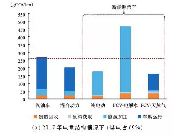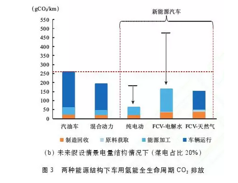 与电能相似,氢能利用的环境影响取决于上游一次能源结构和下游应用场景,其中上游一次能源结构随着可再生能源占比的提高而动态变化,而氢的能源化利用集中在以燃料电池发电为主的车用能源和分布式能源场景。因此本文以氢燃料电池汽车为例,分析当前和未来清洁电源情况下,燃料电池汽车的全生命周期排放,并与内燃机汽油汽车、混合动力汽车、纯电动汽车技术路线进行对比。