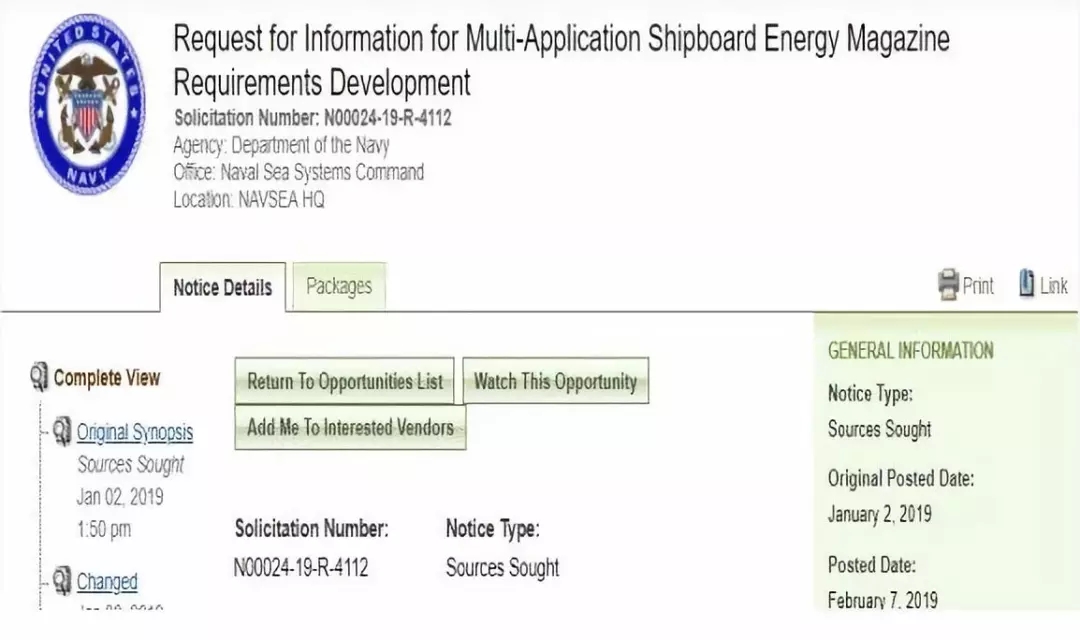 2019年1月2日,海上系统司令部发布了“多用途舰载能量库”研究计划的信息征求,向系统制造商、系统集成商及学术界征求信息,以支撑能量库技术发展。