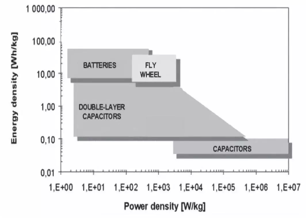 储能技术的主要技术指标包括能量密度和功率密度,如下图所示。一般而言,电池的能量密度较高、功率密度较低,适合持续运行的应用场景;飞轮和电容器则与之相反,其能量密度较低而功率密度较高,适合于需要快速充放电的短时间应用场景。