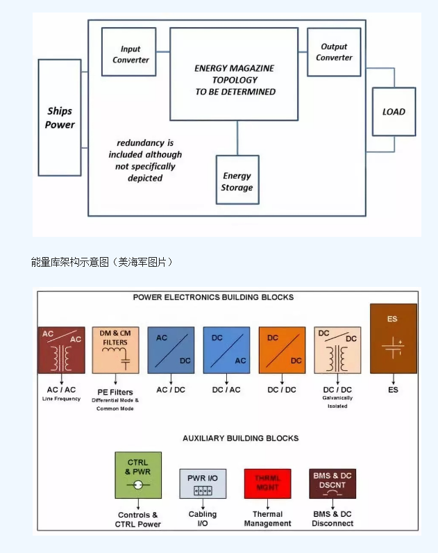 “能量库(Energy Magazine)”是一种面向定向能武器等新型负载的模块化、可扩展的中间电力系统。能量库的目的在于为定向能武器等高能任务系统提供电力,同时保护能量系统及平台其他系统不受任务系统产生的脉冲的影响。同时,能量库的变电器是双向的,可支持舰艇平台的能量管理、负载均衡和应急供电。