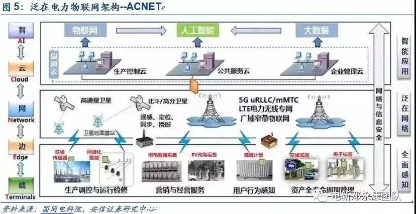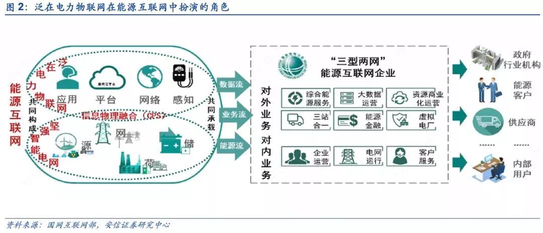 承载数据流——国网对于“泛在电力物联网”的功能定位。“要充分应用移动互联、AI以及先进通信技术,实现电力系统各个环节万物互联、人机交互,打造状态全面感知、信息高效处理、应用便捷灵活的泛在电力物联网,为电网安全经济运行、提高经营绩效、改善服务质量,以及培育发展战略性新兴产业,提供强有力的数据资源支撑。”——在2019年1月发布的国网1号文件中,制定了上述的明确目标。从中可以看出,国网未来将通过建设电力互联网发展与互联网经济相关的新业态,包括新能源、智能制造、智能家居、智慧城市等新业务,非传统领域的新业态已经和传统电网业务处于同等重要的地位。