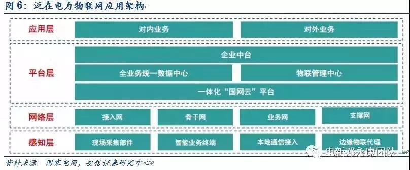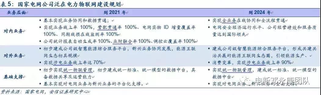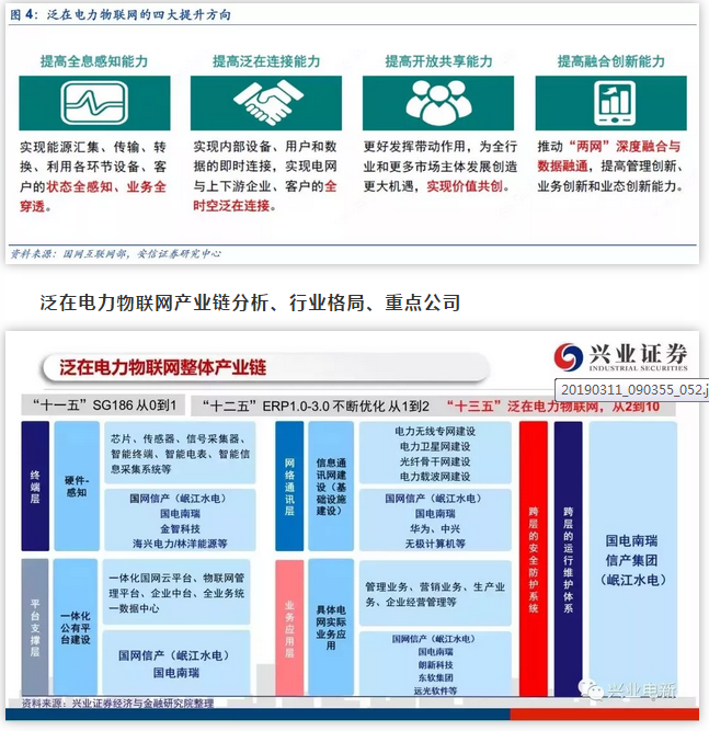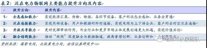全息感知、泛在连接、开放共享、融合创新,目标2024年全面建成泛在电力物联网。国网提出了两个阶段的战略安排,即到2021年初步建成泛在电力物联网,基本实现业务协同和数据贯通,初步实现统一物联管理,各级智慧能源综合服务平台具备基本功能,支撑电网业务与新兴业务发展。到2024年建成泛在电力物联网,全面实现业务协同、数据贯通和统一物联管理,公司级智慧能源综合服务平台具备强大功能,全面形成共建共治共享的能源互联网生态圈。为了加快泛在电力物联网建设,国网计划从全息感知、泛在连接、开放共享、融合创新四个方面进行提升。具体包括:1)将没有连接的设备、客户连接起来,没有贯通的业务贯通起来,没有共享的数据即时共享出来,形成跨专业数据共享共用的生态,把过去没有用好的数据价值挖掘出来。2)考虑到电网存在被“管道化”风险,需要利用公司电网基础设施和数据等独特优势资源,大力培育发展新兴业务,在新的更高层次形成核心竞争力。