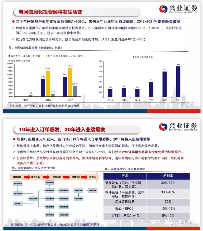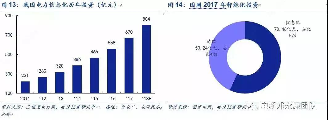 国网智能化投入有望加速。2017年国网智能化投资124亿元,其中信息化和通信分别投资53亿和70亿,同比分别增7.5%和15%。到2018年底,国网公司建成全球规模最大的电力专用通信网,光缆总长达152.08万千米,设备52.77万台/套,站点8.8万座,骨干网带宽400Gbps,承载各类业务通道40.32万余条。考虑到泛在电力特联网全面建设即将展开,我们预计,未来几年电网智能化投资金额与占比有望同时快速提升。