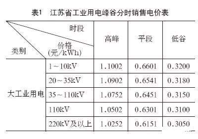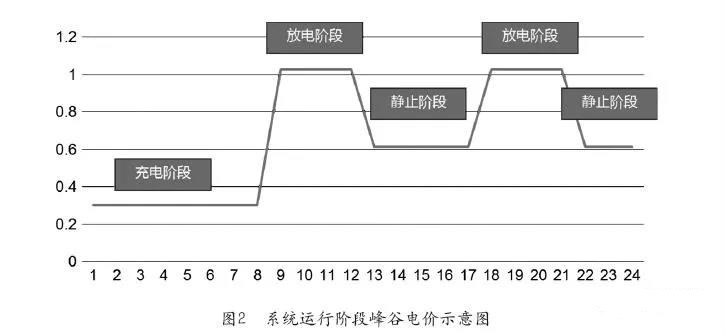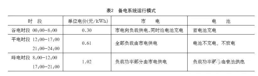 以江苏省为例,储能系统的充放电时段:在谷区时段利用低电价充电,而在峰区(或尖峰)时段储能系统放电,减少其间的电网用电量,不仅可以降低电网在高峰时段的用电压力,而且企业可以利用峰谷电价差降低电费支出,从而获得收益,收回储能系统的项目投资。表1为江苏省工业用电峰谷分时销售电价表。图2为系统运行阶段峰谷电价示意图。表2进一步给出了备电系统运行模式,利用谷电、平电和峰电时段的电价差,设置备电系统的运行模式,以取得更大的经济效益。
