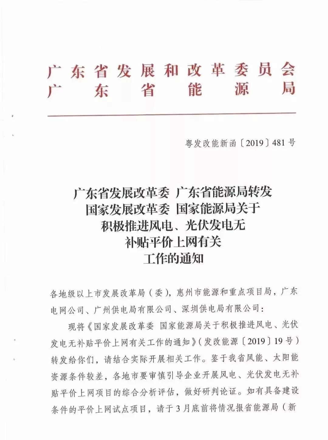 一、广东:3月底前申报光伏、风电平价上网试点项目