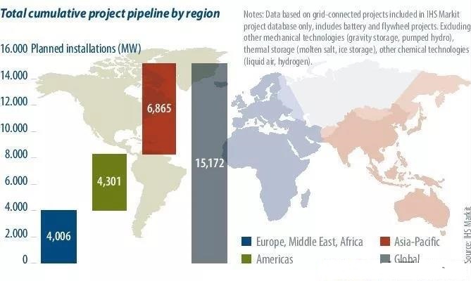 随着项目管道的持续增长,电池储能有一个积极的未来,2019年初达到15.2吉瓦,这是新型抽水蓄能(PHES)管道规模的一半。亚太地区拥有最强大的管道,但它包括一些投机项目,如果它们完成,将使当前世界上最大的单站点储能项目相形见绌。