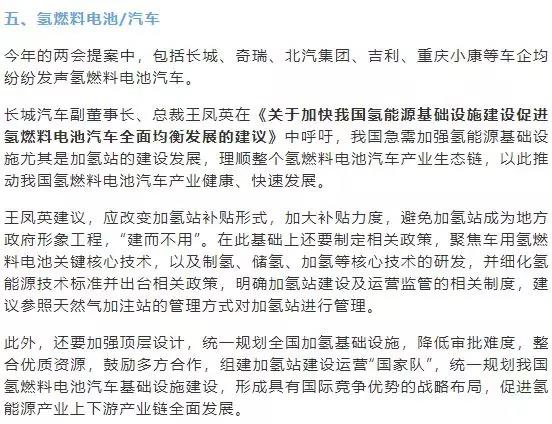 相比以往,氢燃料电池提案增多,一是国内氢燃料产业链在慢慢发展壮大;二是车企也在积极推动旗下产品的更迭,以应对市场竞争。