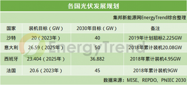 根据方案,计划到2020年光伏装机容量达8.409GW。2030年,西班牙74%的电力将来自可再生能源,占总能源需求的41%。到2050年,光伏装机容量达50-60GW。此外,西班牙还计划将储能项目增加至6GW。