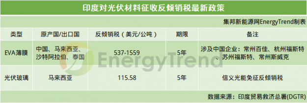 此外,印度贸易总署(DGTR)还建议对从中国、马来西亚、沙特以及泰国进口的光伏组件用EVA薄膜征收537-1559美元/公吨(MT)的反倾销税,期限为5年。
