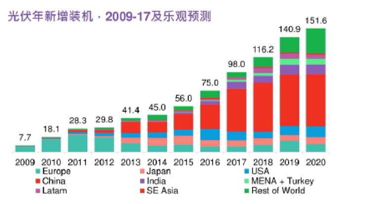 除中国以外的其他亚太国家市场方面,日本2017年装机总量为7.5GW,未来规模会因为BIPV的技术导入,扩大新的市场空间,每年的新增量还会在7GW~10GW以上。印度作为快速发展的光伏市场之一,预计到2020年每年新增装机量约为10-13GW左右。澳大利亚发展也很快,2018年的装机量将超过2GW。