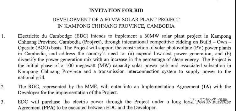 柬埔寨招标文件中称此举将促进低成本发电的部署、使电力结构形式保持多样化并提高清洁能源的比例。