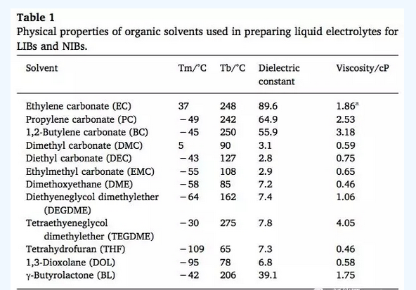 下表为常见的有机溶剂的物性参数,从表中我们能够注意到环状溶剂,例如EC和PC具有较高的介电常数,但是粘度也比较大,而线状溶剂,例如DMC和DEC等介电常数比较低,但是粘度比较低,因此为了同时满足较高的介电常数和较低的粘度的要求,在锂离子电池中环形溶剂和线形溶剂通常会混合使用,Ponrouch等人的研究则进一步显示将碳酸脂类溶剂与醚类溶剂混合使用能够获得更好的电导率和更好的循环性能,因此通常Na离子电池的电解液也需要多种溶剂混合使用。