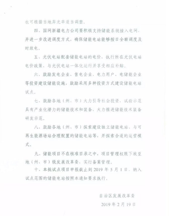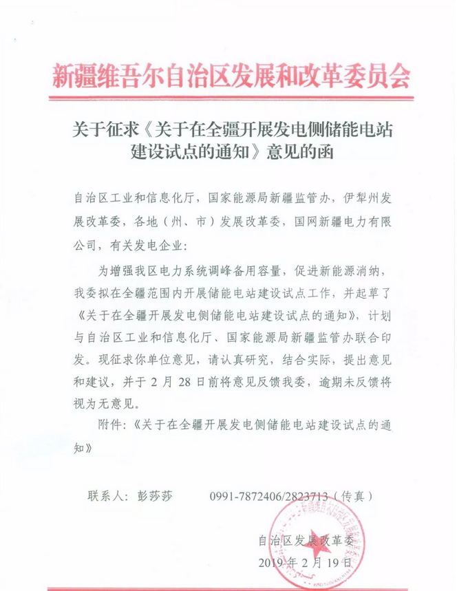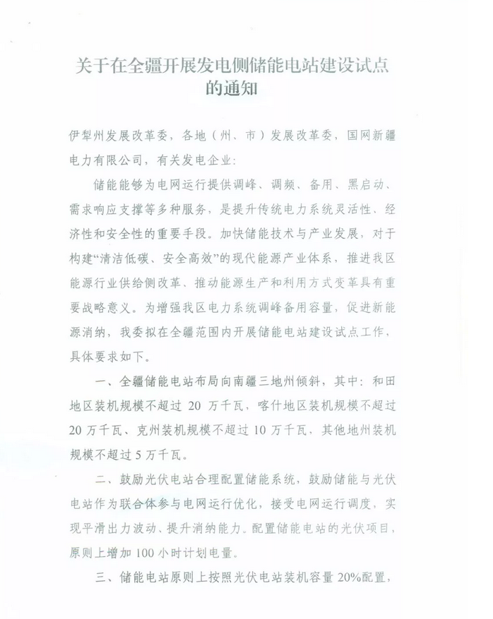 2月19日,新疆自治区发改委印发《关于在全疆开展发电侧储能电站建设试点的通知》,以达至增强新疆电力系统调峰备用容量,促进新能源消纳的战略目标。
