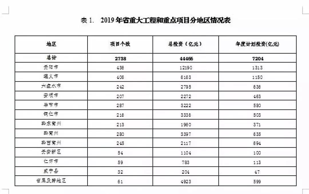贵州省省重大工程和重点项目建设工作领导小组办公室今日下达《2019年贵州省重大工程和重点项目名单及推进计划的通知》,通知表明,2019年共安排省重大工程和重点项目2738个,总投资44466亿元,2019年计划投资7204亿元。其中:收尾项目323个,总投资3774亿元,年度计划投资822亿元;续建项目1326个,总投资25294亿元,年度计划投资4420亿元;新建项目653个,总投资7908亿元,年度计划投资1607亿元;预备项目436个,总投资7490亿元,年度计划投资355亿元。