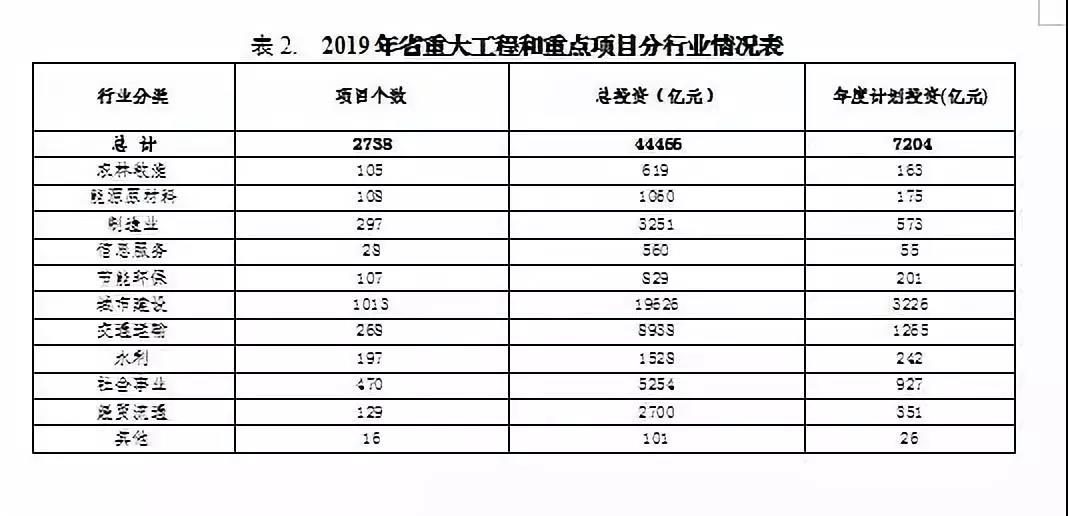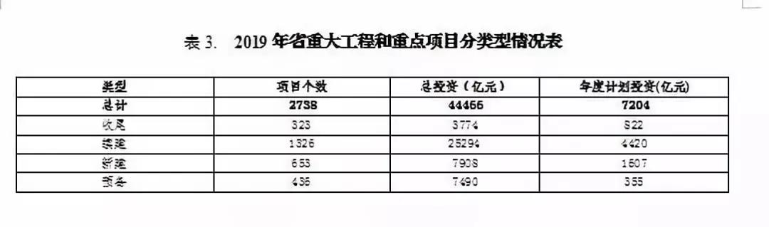 2019年共安排省重大工程和重点项目2738个,总投资44466亿元,2019年计划投资7204亿元。其中:收尾项目323个,总投资3774亿元,年度计划投资822亿元;续建项目1326个,总投资25294亿元,年度计划投资4420亿元;新建项目653个,总投资7908亿元,年度计划投资1607亿元;预备项目436个,总投资7490亿元,年度计划投资355亿元。