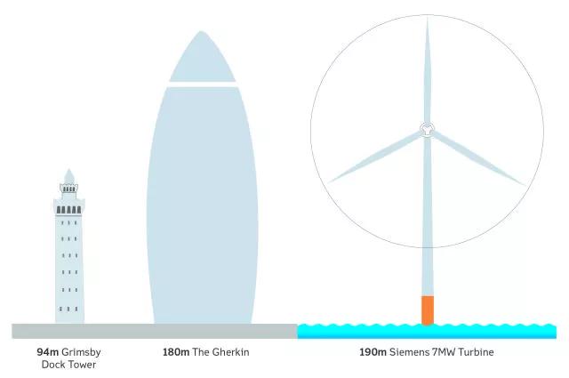 Hornsea One风电场将安装174台风机,目前安装的风机每台风机叶轮直径164米,高达190米,超过英国伦敦标志性建筑小黄瓜(Gherkin)的高度。