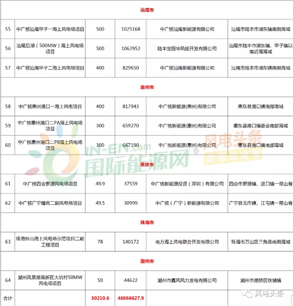 广东省发改委共核准64个风电项目,建设规模共计30210.6MW,总投资达46866627.9万元(约4686.67亿元)。