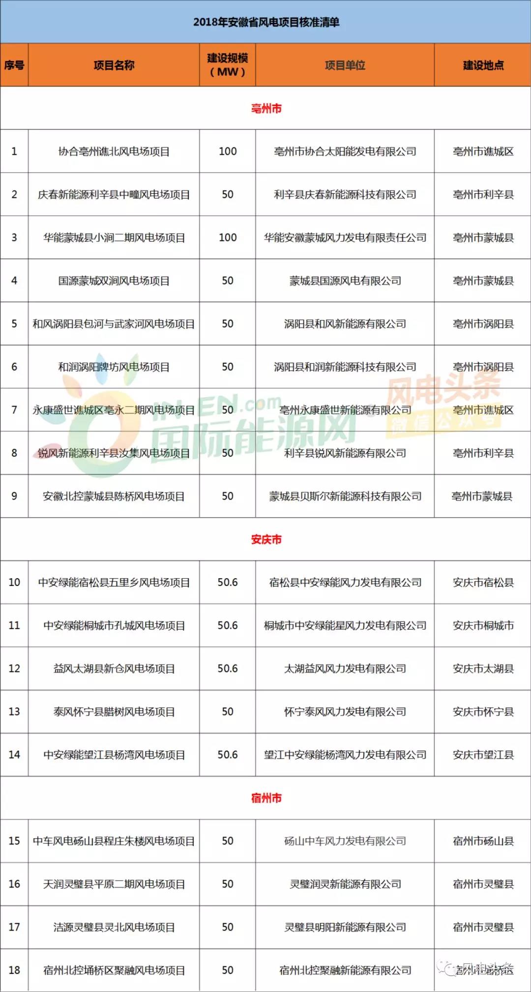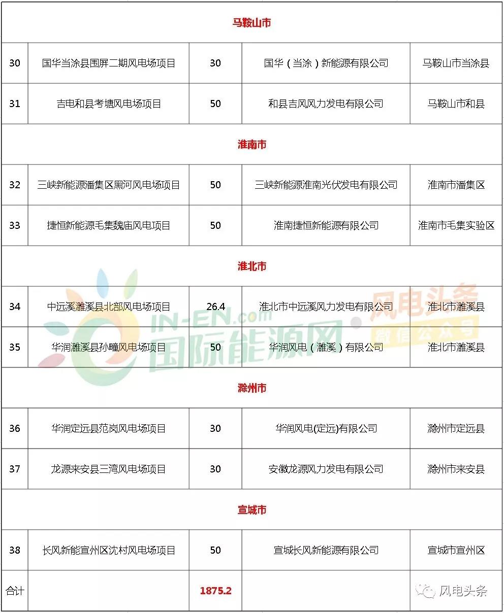 安徽省发改委共核准38个风电项目,建设规模共计1875.2MW。