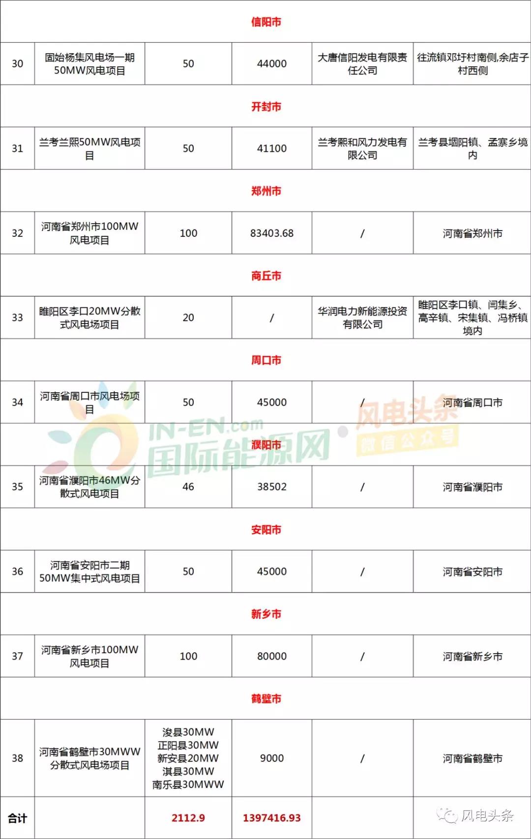 河南省发改委共核准38个风电项目,建设规模共计2112.9MW,总投资达1397416.93万元(约139.74亿元)。