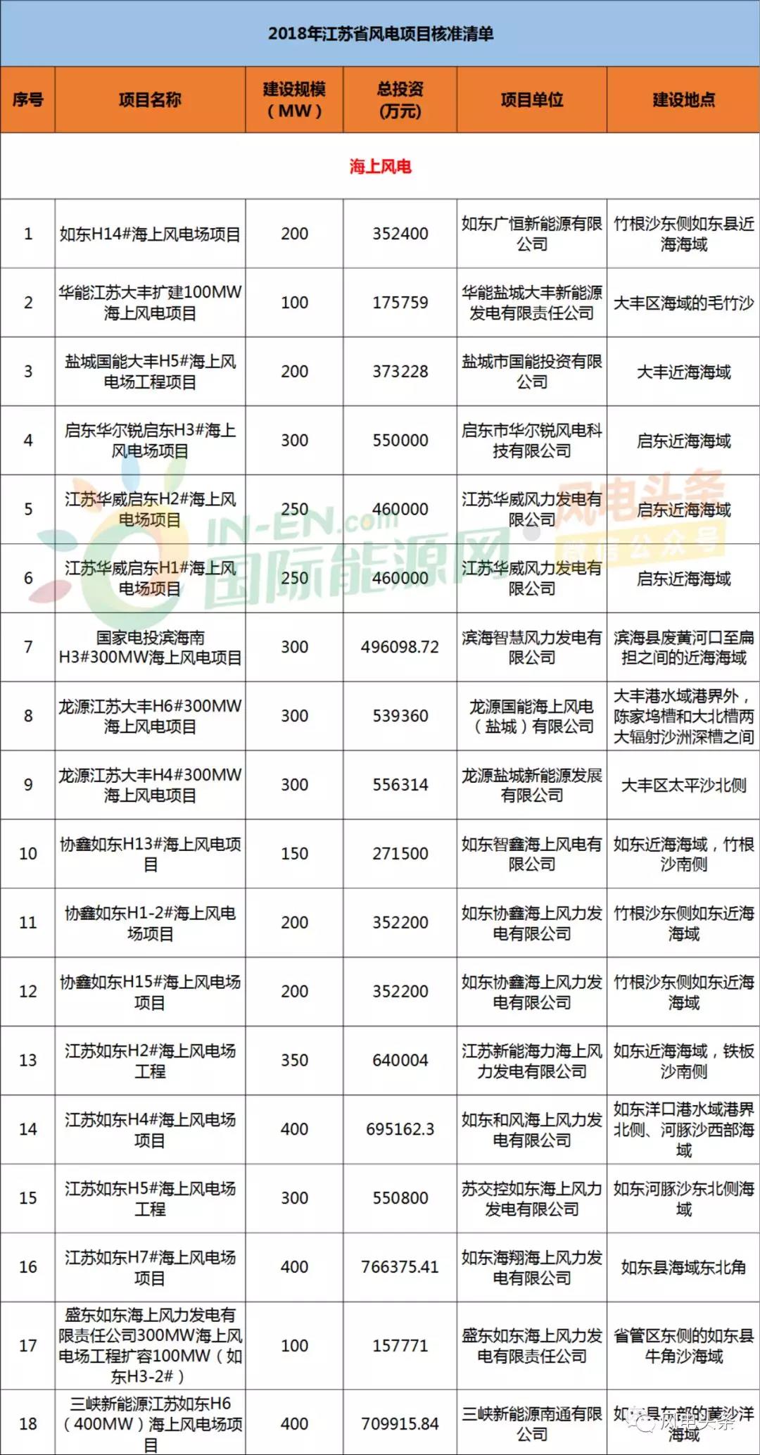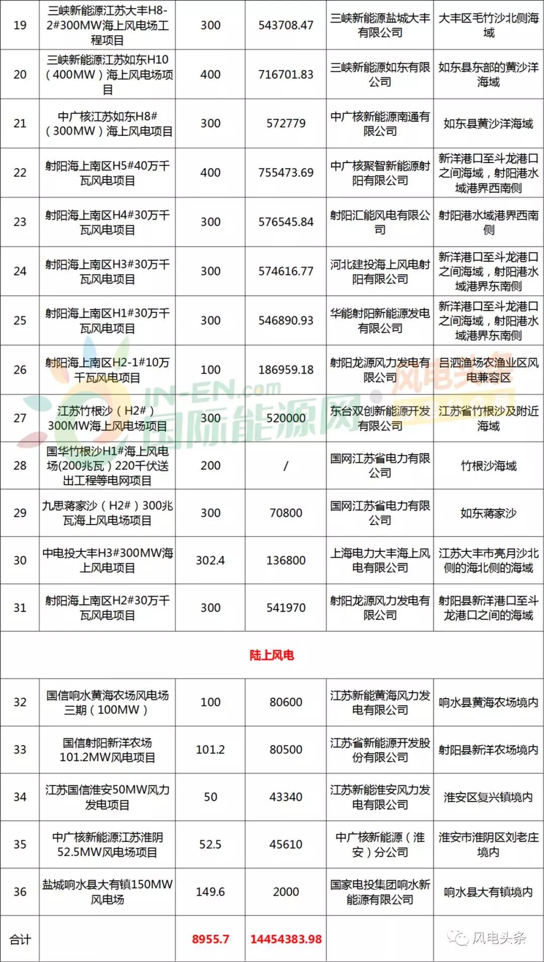 江苏省发改委共核准36个风电项目,建设规模共计8955.7MW,总投资达14454384万元(约1445.44亿元)。