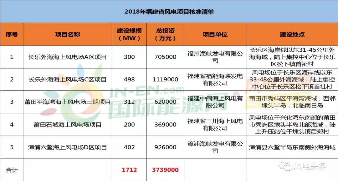 福建省发改委共核准5个风电项目,建设规模共计1712MW,总投资达3739000万元(约373.9亿元)。