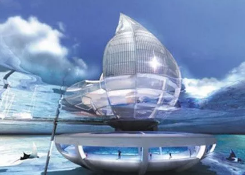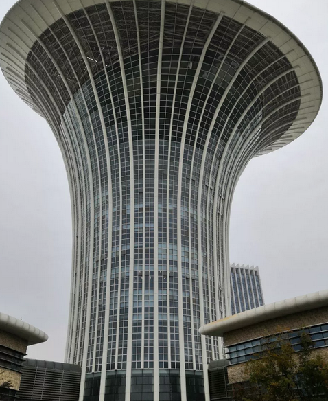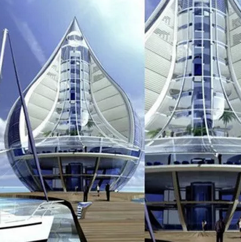 一座马蹄莲形状地标建筑,集高科技新能源于一身。楼顶安装了光伏发电、风力发电和自动集雨等装置,把光能和风转化成电能,把雨水变成了楼内冲马桶用水,既节约能源又环保。
