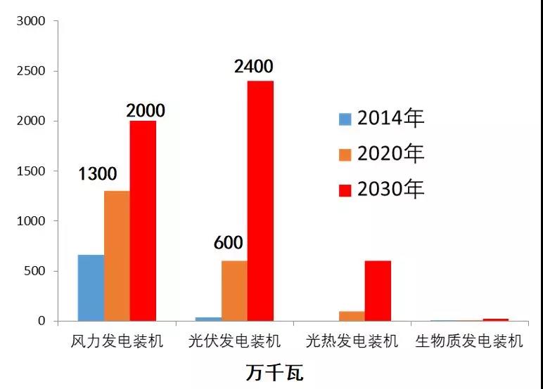在增大当地消纳的同时,电力外送仍然是电力领域的重中之重。预计2020年、2030年分别有1650万千瓦、4300万千瓦装机规模的可再生能源需集中外送。