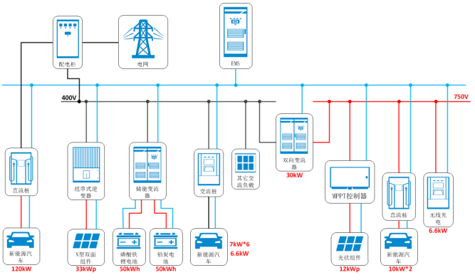 西开有限公司分布式园区微电网采用先进的交直流变换技术,构建交直流(交流400V,直流±375V)混合微电网模型,研究、控制能量的双向流动,为西开有限公司在未来交直流配网核心技术领域积累了宝贵的经验。园区微电网项目以解决多种新能源柔性并网为依托,建设容量为330千瓦、蓄电池容量为100千瓦时、负荷容量为195.6千瓦、新能源发电容量为30.94千瓦的新型园区微电网。项目主要由光伏车棚、风力发电机组、充电桩(直流快充、交流慢充、充放电一体机、无线充电桩)、智慧能源舱构成。
