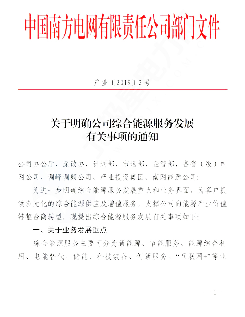 近日,南方电网产业部发布了《关于明确公司综合能源服务发展有关事项的通知》(产业〔2019〕2号),该文件明确表示要“进一步明确综合能源服务发展重点和业务界面,为客户提供多元化的综合能源供应及增值服务,支撑公司向能源产业价值链整合商转型”。根据文件内容,南方电网综合能源服务将主要聚焦于新能源、节能服务、能源综合利用、电能替代、储能、科技装备、创新服务、“互联网+”等八大业务版块,重点抓住产业园区、工业企业、大型公共建筑、大型商业综合体、交通枢纽、数据中心等对象,瞄准重大项目资源,统筹运用能效诊断、节能改造、用能监测、分布式新能源发电、冷热电三联供、现代储能等多种技术,开展并引领综合能源服务业务发展。