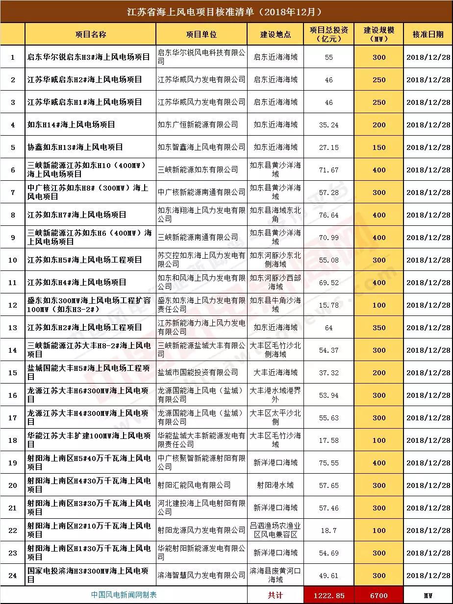近日,江苏省发改委连续核准批复24个海上风电项目,规模总计670万千瓦,总投资达1222.85亿元。